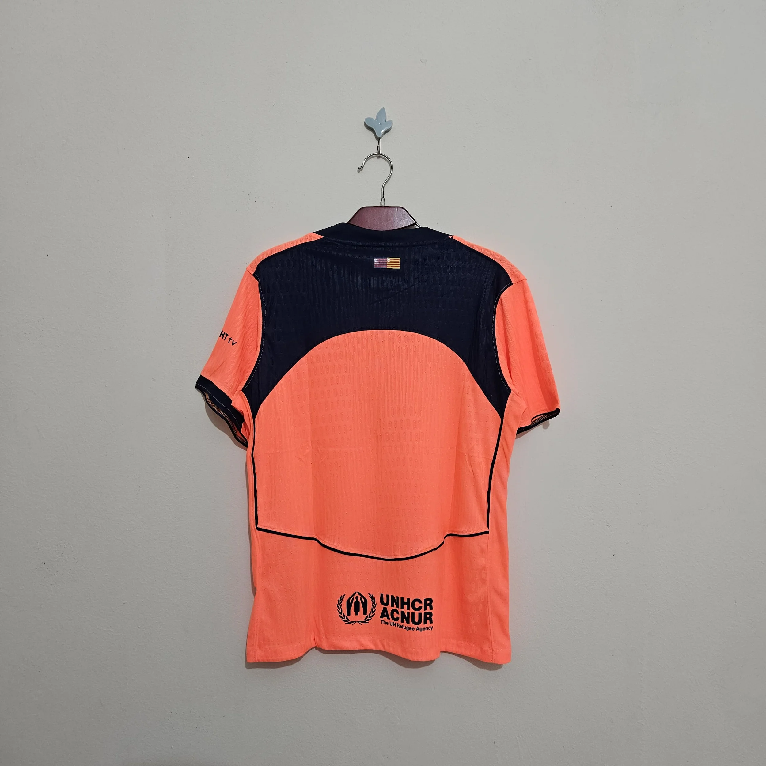 The Barcelona Third Jersey 25/26 introduces a vivid new style on the pitch, mixing innovation and nostalgia. This distinctive design, dressed in Bright Mango (orange) with Midnight Navy highlights, revives a colorway evocative of Barcelona’s iconic 2009-11 away and third kits, making it both current and nostalgic for long-time fans.